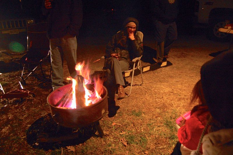 People waiting their turn to bounce huddle around a toasty fire Tuesday night at Bouncing For Turkeys held at Devils Backbone Brewing.