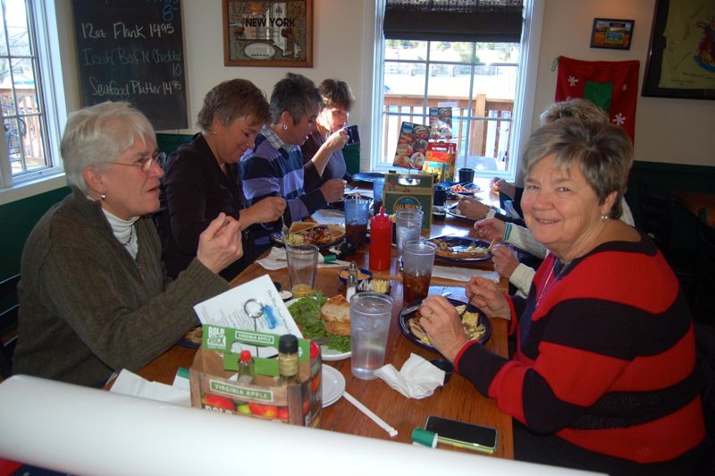 A group enjoys breakfast, including waffles from the new waffle and fruit bar this past Sunday morning.