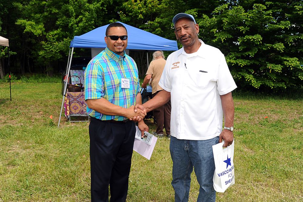 Two opposing sheriff’s candidates having a handshake. Mike Thompson (left) and Vasco Wright (right)
