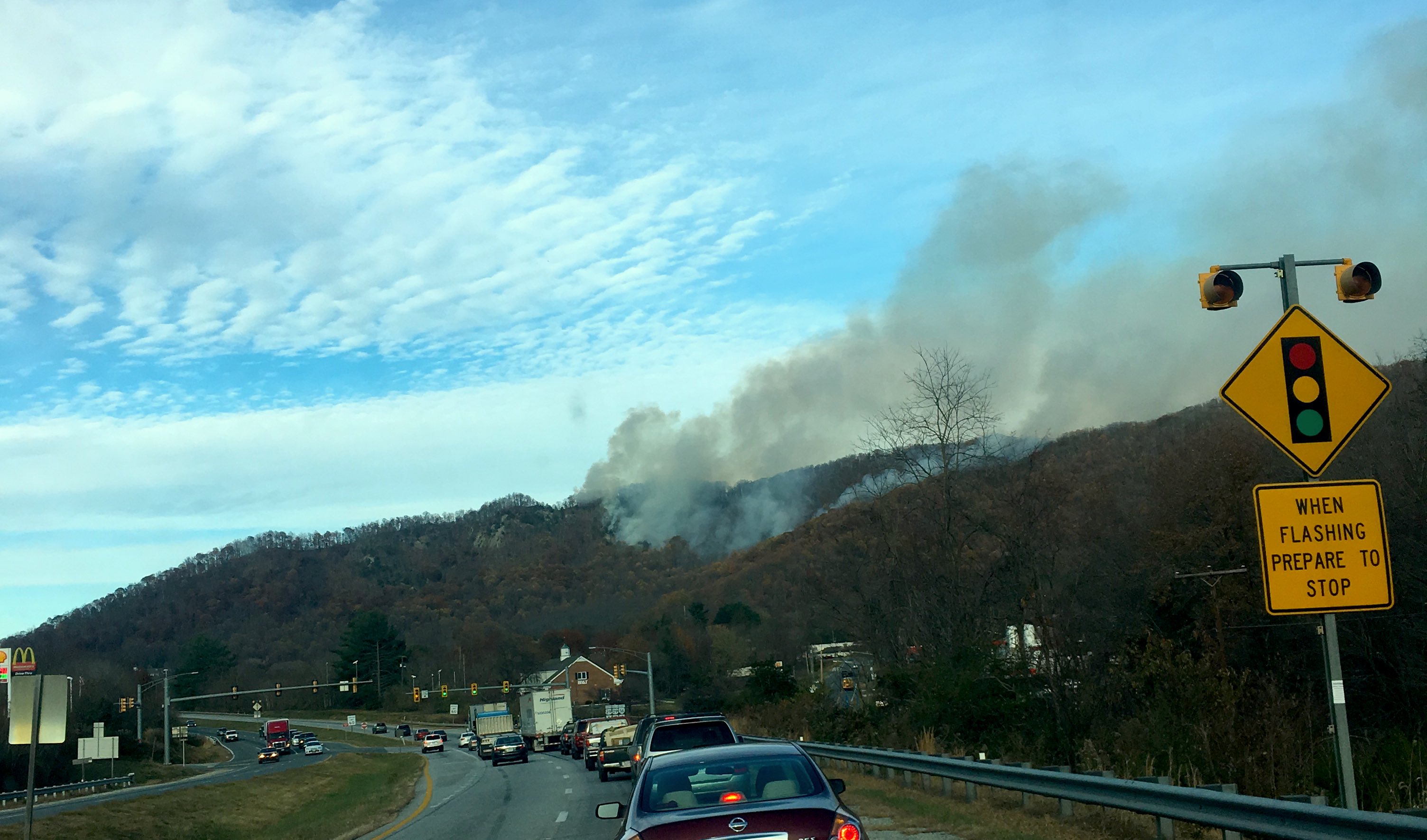 Photo Courtesy of Frank Wood : Fire continues burning on the mountainside above St. Mary's Catholic Church just north of Lovingston around noon Tuesday - November 22, 2016.