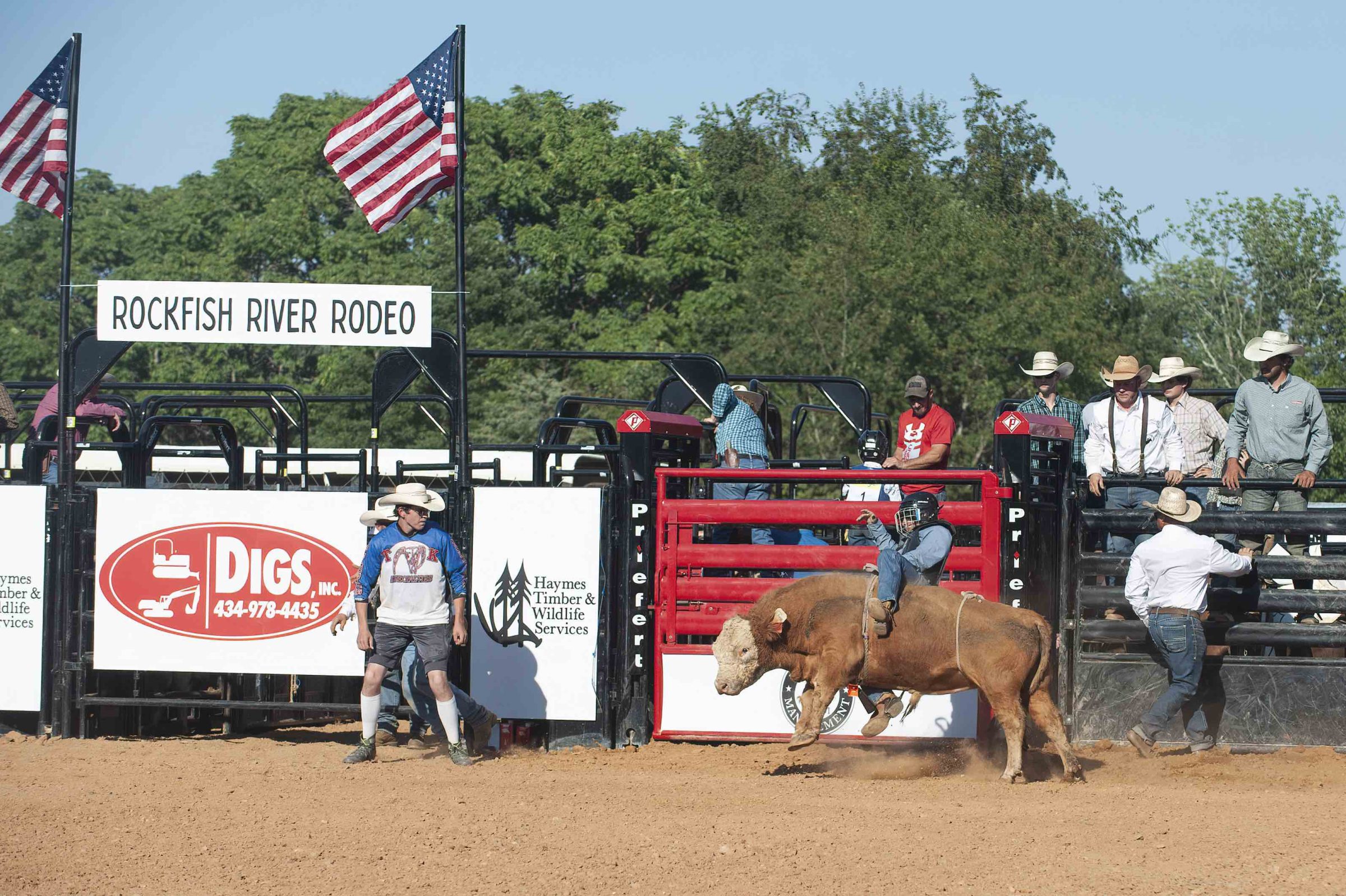 A bull rider takes to the arena at the Rockfish River Rodeo in Beech Grove / Roseland in Nelson County, VA – Saturday – September 2, 2023