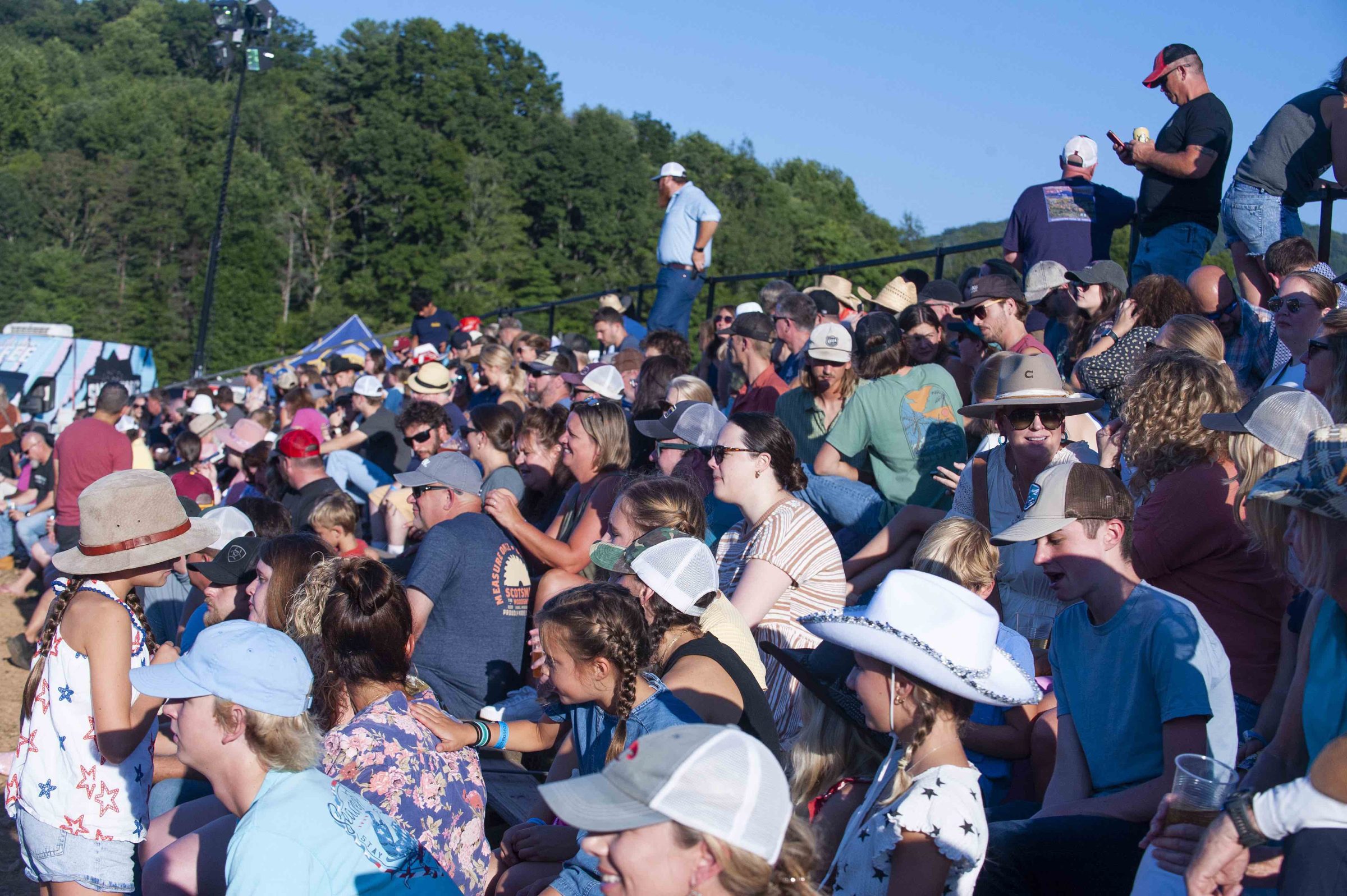 The crowd cheers on riders during the 2nd Annual Rockfish River Rodeo in Beech Grove / Roseland in Nelson County, VA – Saturday – September 2, 2023