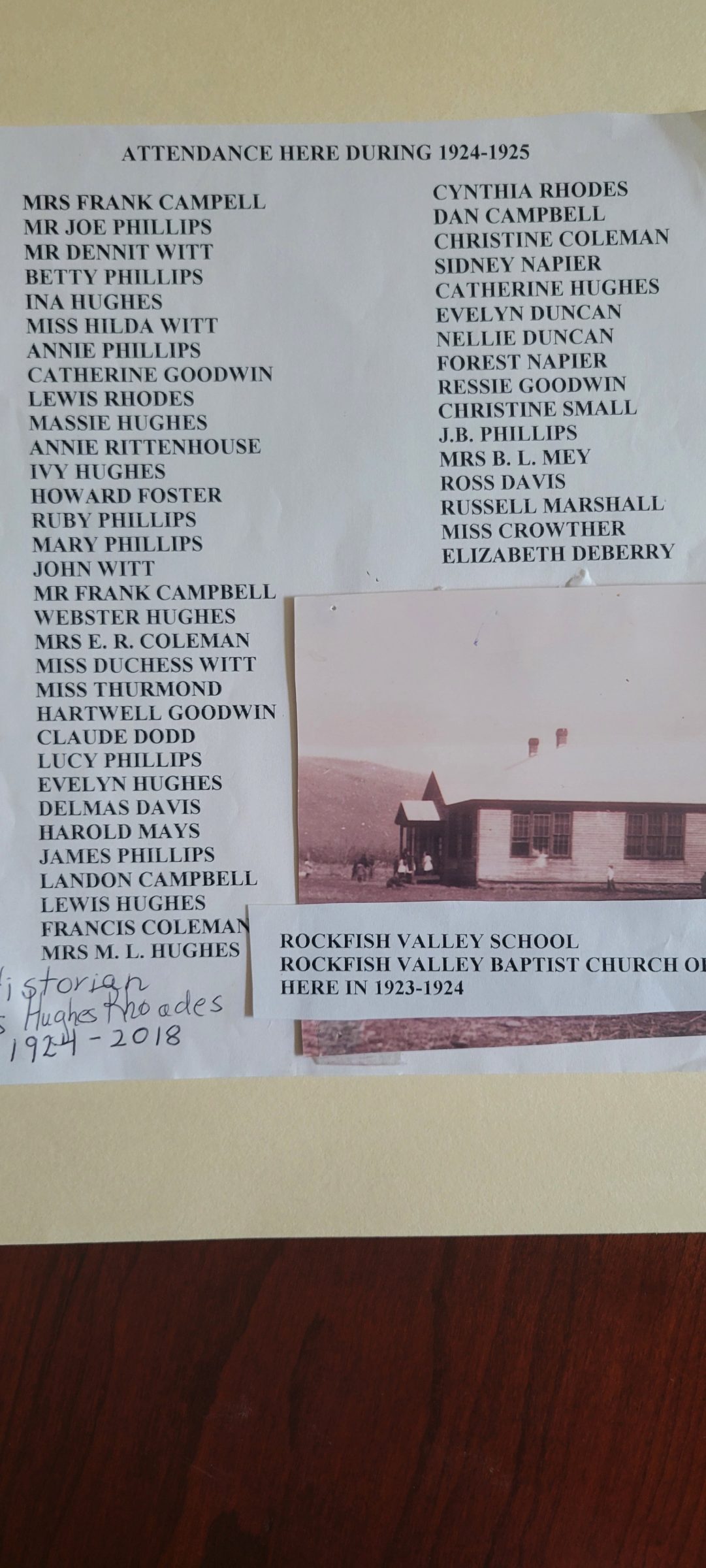 The year was 1924. A plaque in the church says, “AFTER MANY YEARS OF TRAVELING 1-2 HOURS BY HORSE AND BUGGY TO CHURCH, A COMMITTEE, LEAD BY J.T. PHILLIPS, WAS FORMED AND IN 1924 ROCKFISH VALLEY BAPTIST CHURCH WAS ORGANIZED.” That’s how Rockfish Valley Baptist Church, right off of Route 151 in Nellysford got its start!