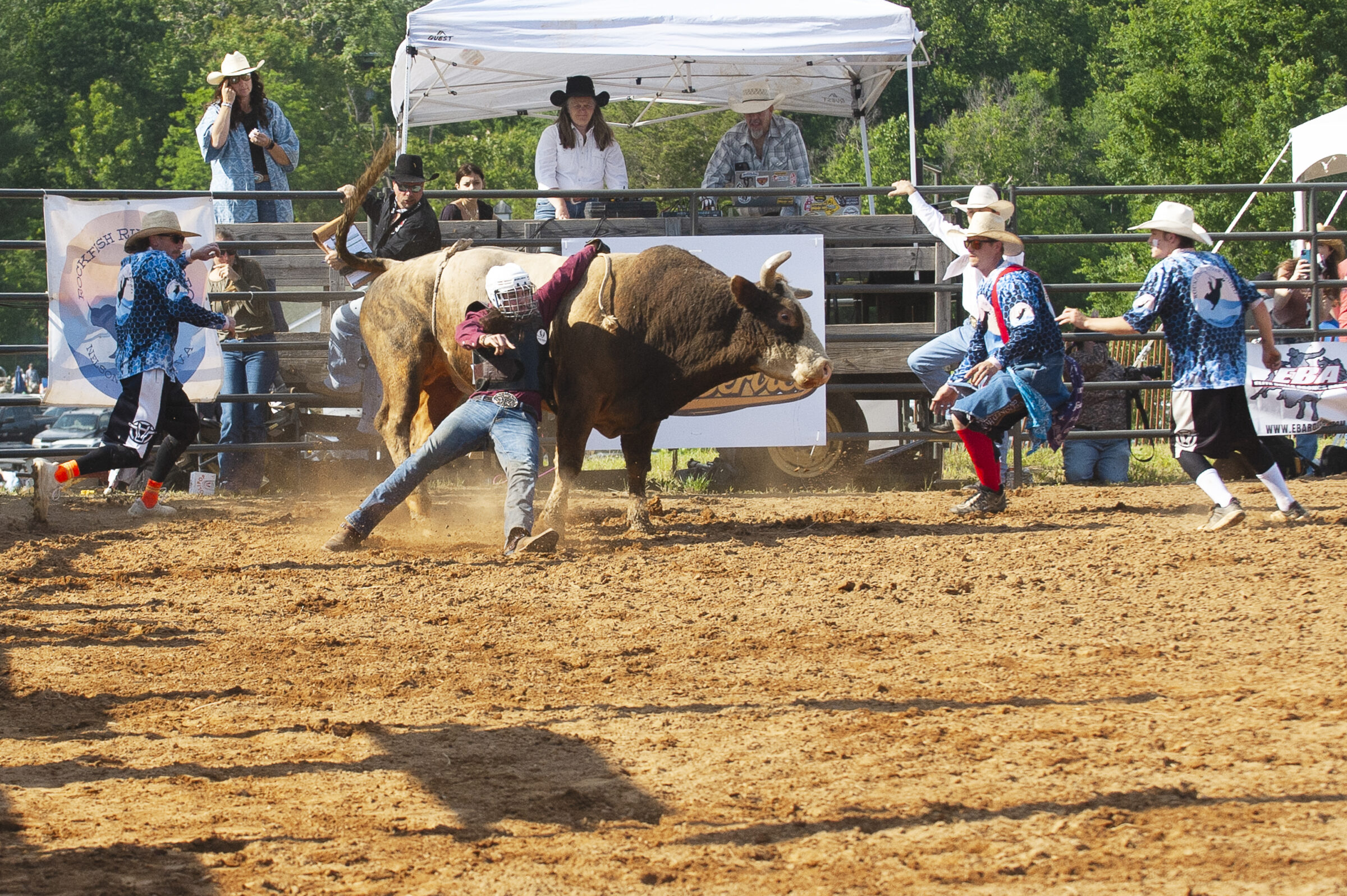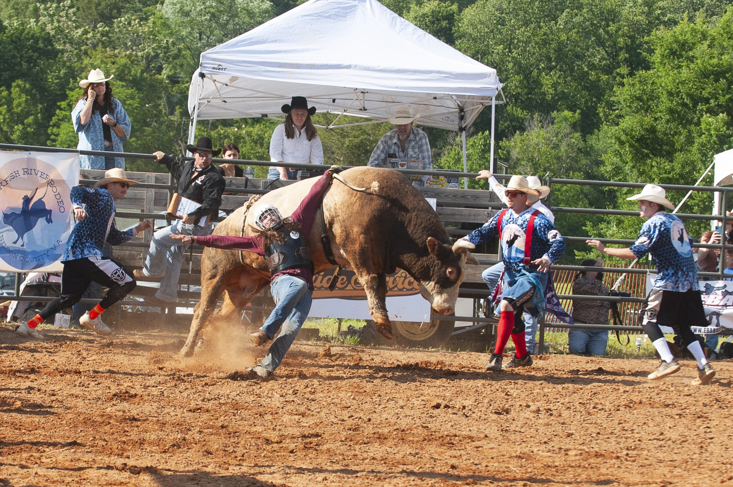 Photo By BRL Mountain Photographer Paul Purpura : A bull rider gets thrown during the Rockfish River Rodeo this past weekend in Beech Grove of Nelson County, Virginia. Saturday - May 31, 2025