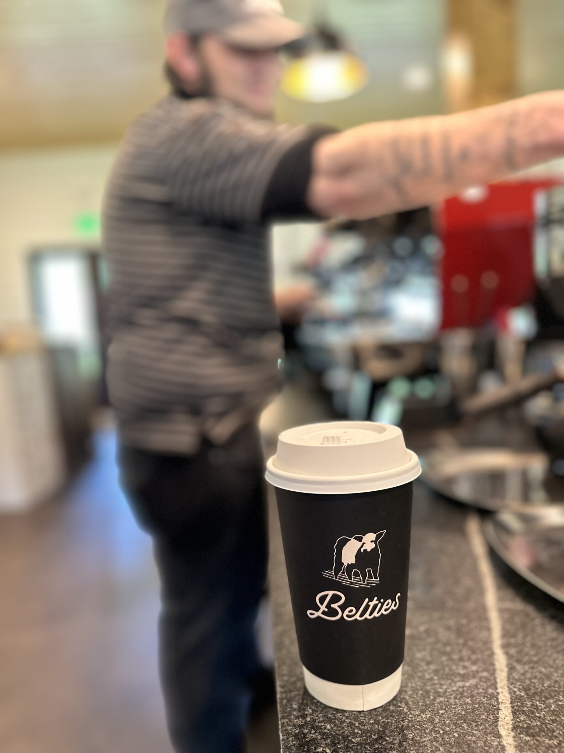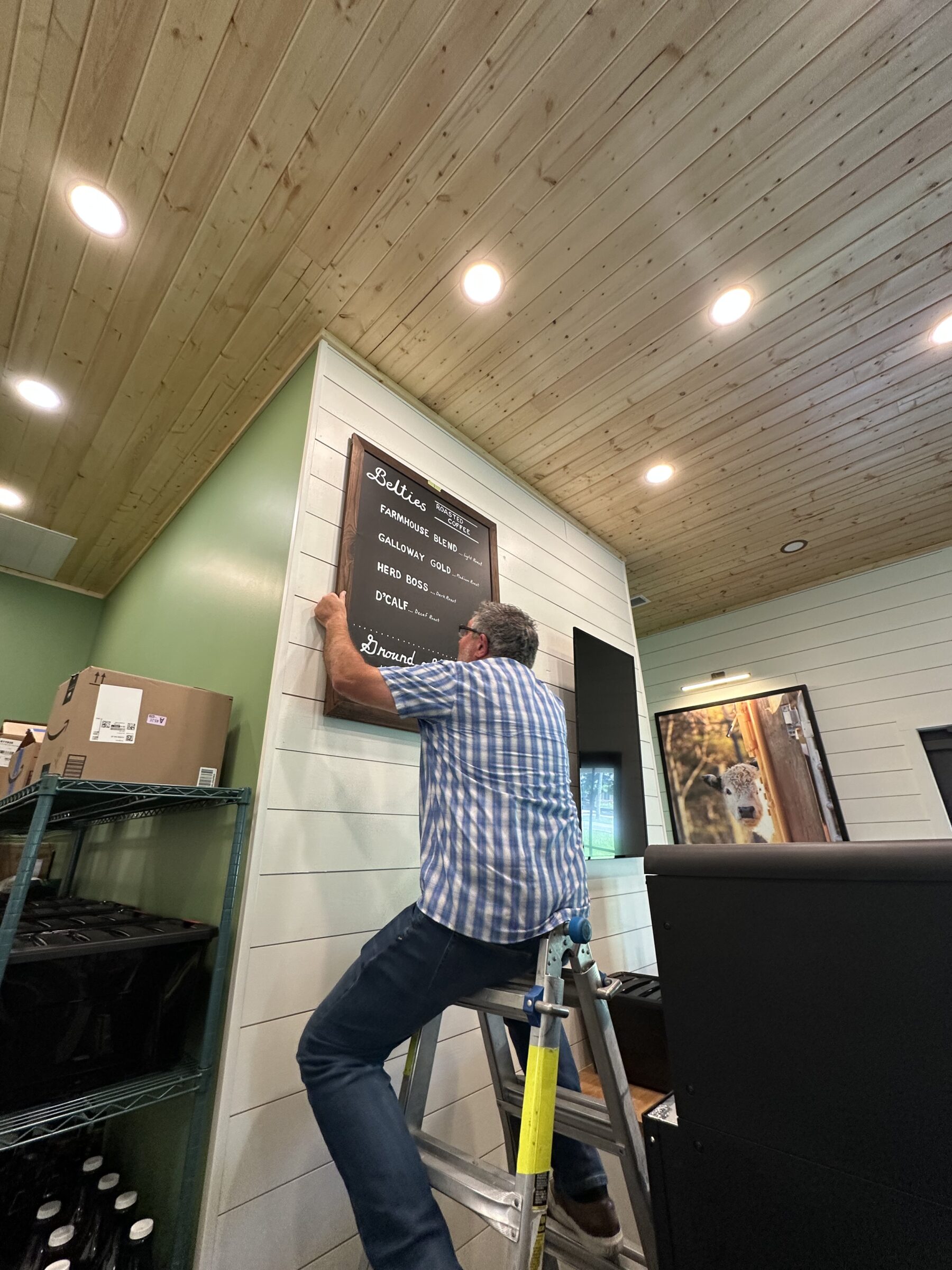 The idea of a coffee shop and restaurant named Belties is something Washburn loosely brainstormed from memories of his days living in New Zealand. “I remember back there electricians were called sparkies. Contractors were called chippies. there was this mateship sort of comradery.” He latched on to that ies iteration when they named it Belties. Belted cows, hence Belties. The belted cows that will be on site in Nellysford were imported from Texas.
