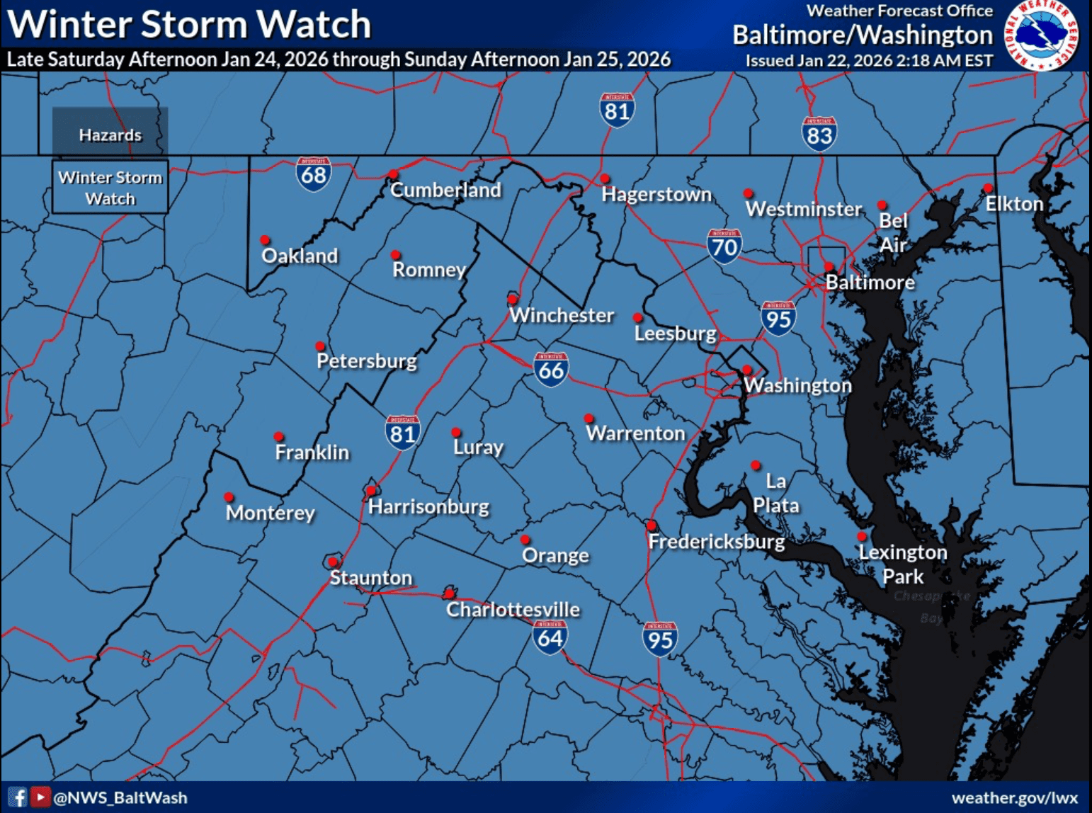 From NWS DC / Baltimore : Winter Storm Watches have been issued for the entire area late Saturday afternoon through Sunday. Plowable snow and significant icing (especially south of I-66/US-50) can be expected. More at weather.gov/lwx/winter. The time is now to prepare to minimize impacts for you and your family.