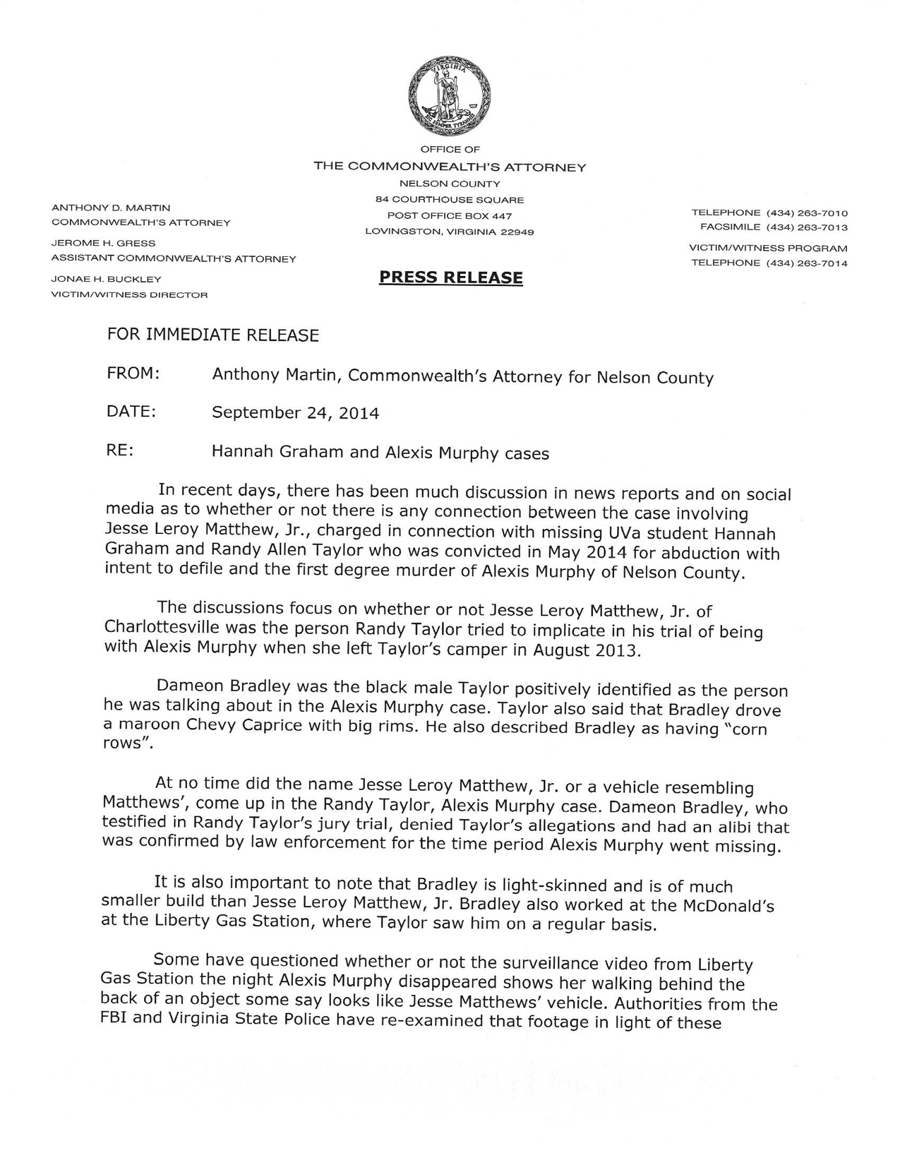 BRLM along with other media outlets received the following release from Nelson’s Commonwealth Attorney Anthony Martin on Wednesday morning.