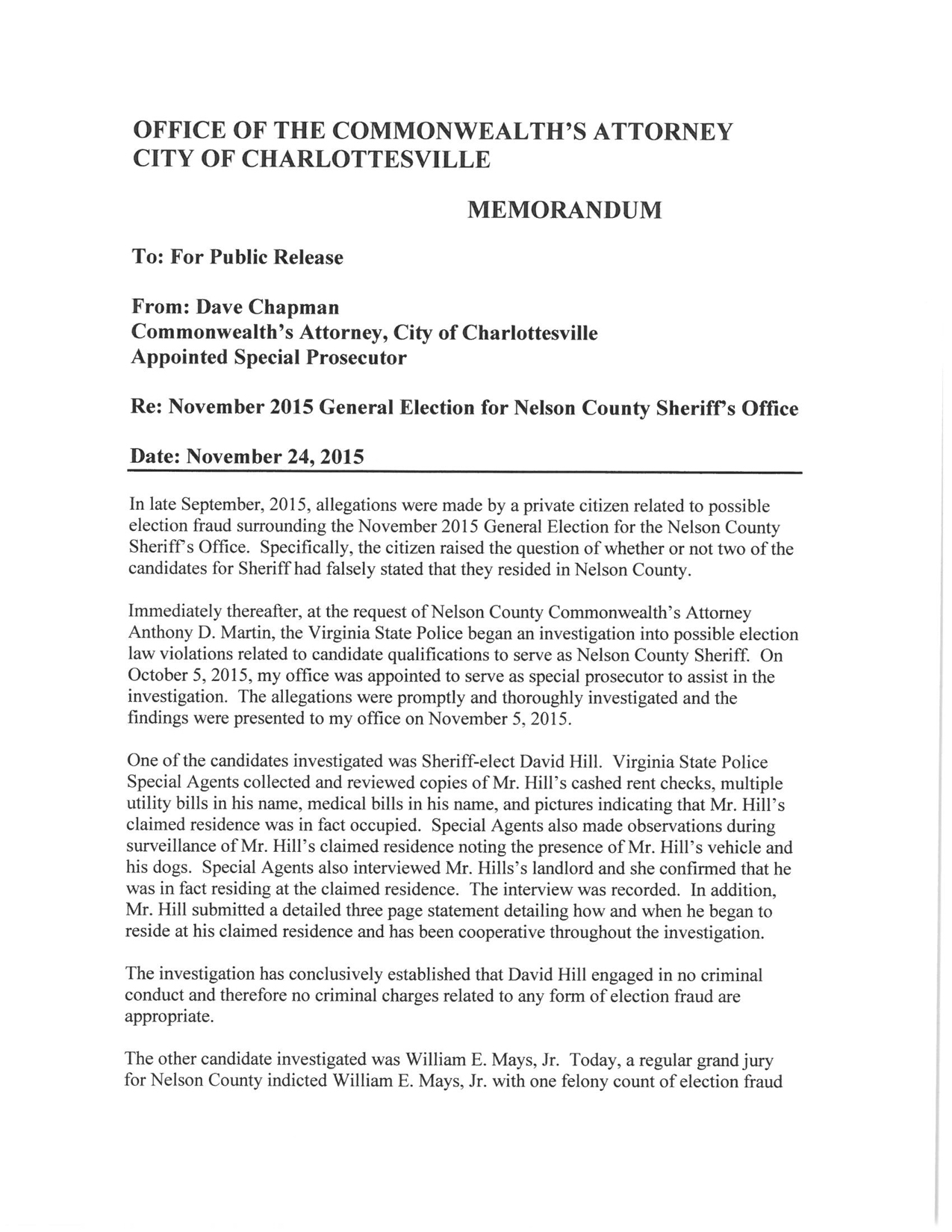 Above, page 1 of the verbatim press release outlining the charges against Lt. Billy Mays of the Nelson County Sheriff's Department. And the clearing of Nelson County Sheriff Elect David Hill regarding residency during the election. Click to enlarge and read.